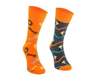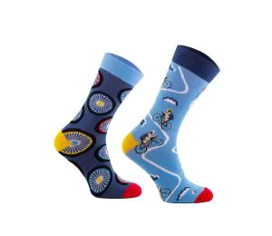 Kolorowe skarpety dla fana dwóch kółek wyprodukowane w Polsce. Obie skarpetki dla fana kolarstwa różnią się od siebie.