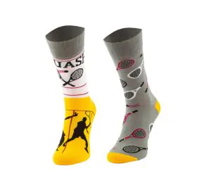 Kolorowe skarpety dla fana squash wyprodukowane w Polsce. Obie skarpetki dla fana squash różnią się od siebie.