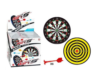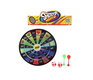 Zestaw do gry w rzutki z kolorową tarczą i czterema rzutkami. Zapakowany w kartonowe pudełko. Zabawka przeznaczona dla dzieci od lat 3. Podane wymiary stanowią wymiar opakowania.