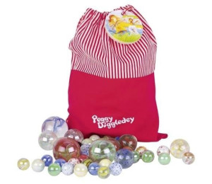 Szklane kulki "Peggy Diggledey". Tradycyjna francuska gra towarzyska z elementami zręcznościowymi. W zestawie 50 kulek.Wymiary: średnica kulek od 1,6 do 3,5 cm
