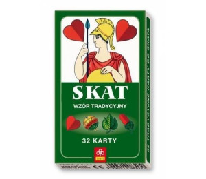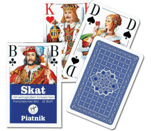 Wysokiej jakości karty do skata renomowanej firmy Ferd. Piatnik & Sohne. Talia 32 kart (od siódemek) z powiększonymi indeksami. Awersy (twarze) wg wzoru niemieckiego. Wyroby wiedeńskiej fabryki...