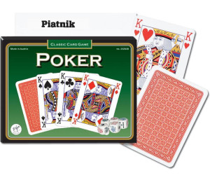 Najwyższej jakości karty do pokera renomowanej firmy Ferd. Piatnik & Sohne. Na awersach powiększone indeksy. Do rozgrywek, w których potrzebna jest lepsza widoczność oraz dla osób słabiej...