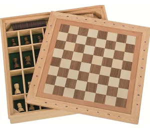 Szachy drewniane w rozmiar 23x23cm po rozłożeniu. Wiek graczy: 7-99 lat. Liczba graczy: 2. Czas rozgrywki: 40 minut. Zawartość: drewniana kasetka z planszą, drewniane figury szachowe.