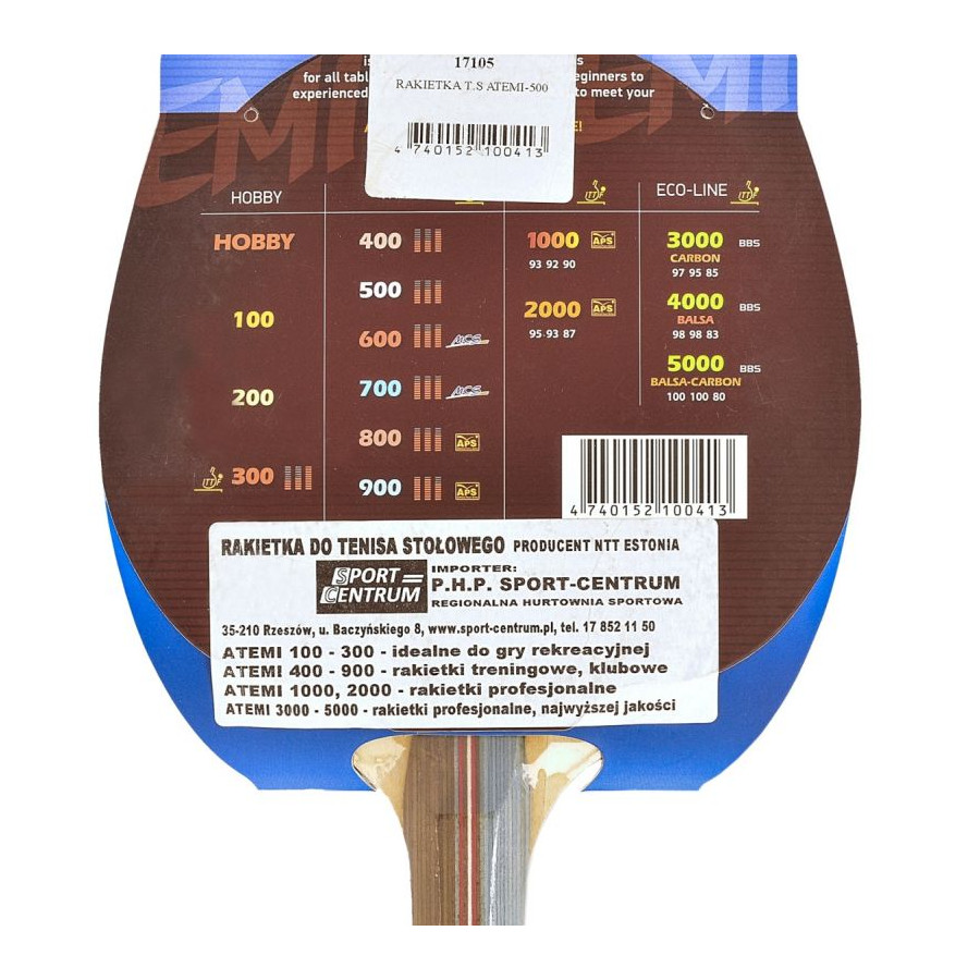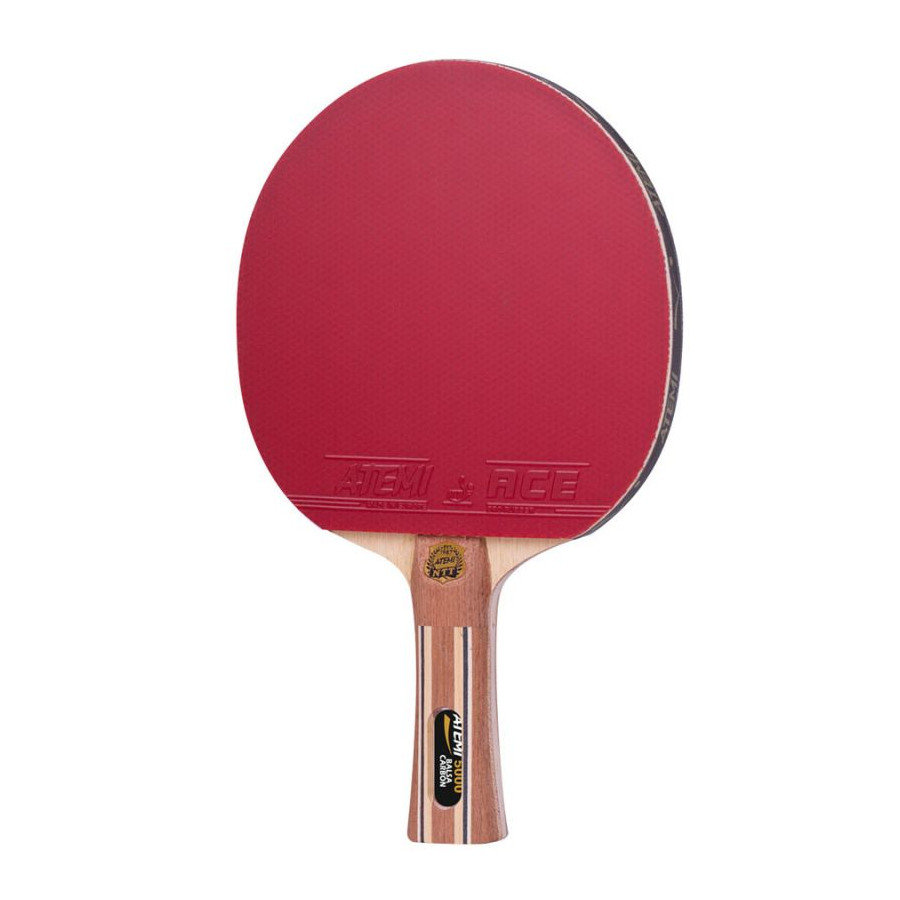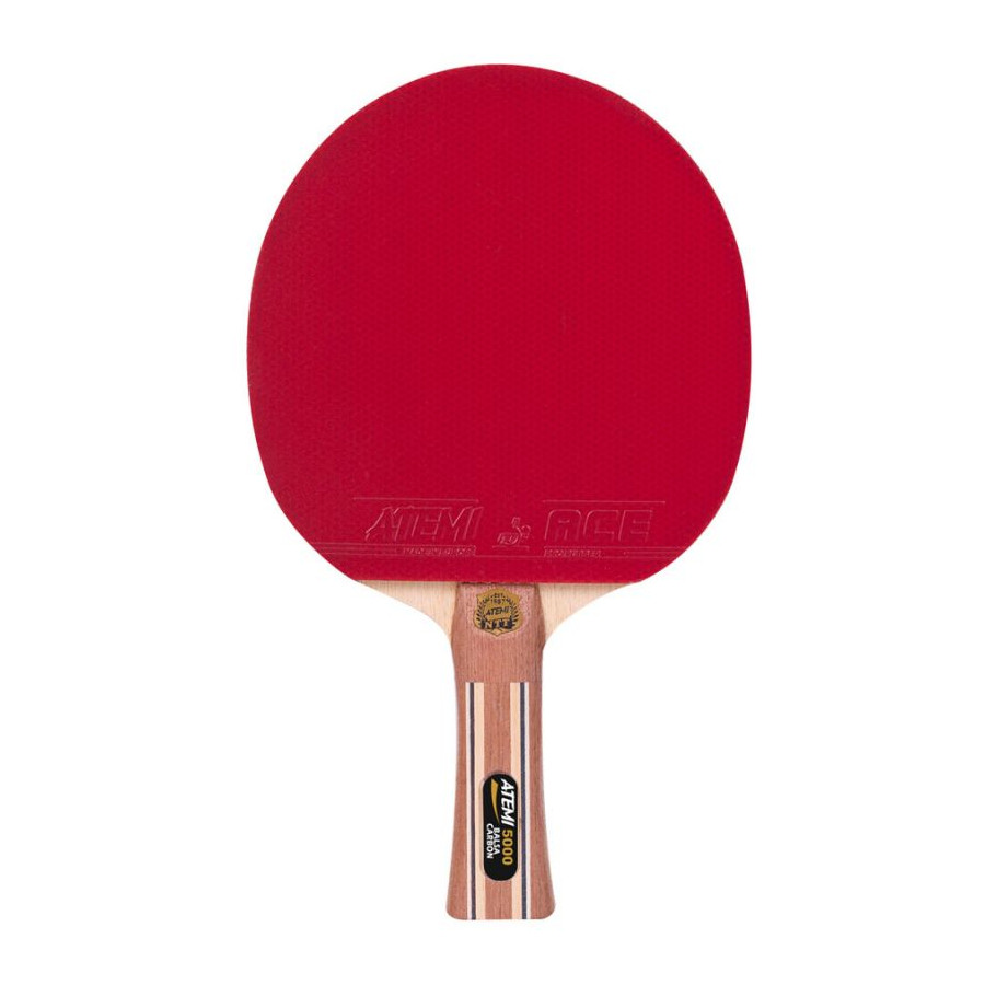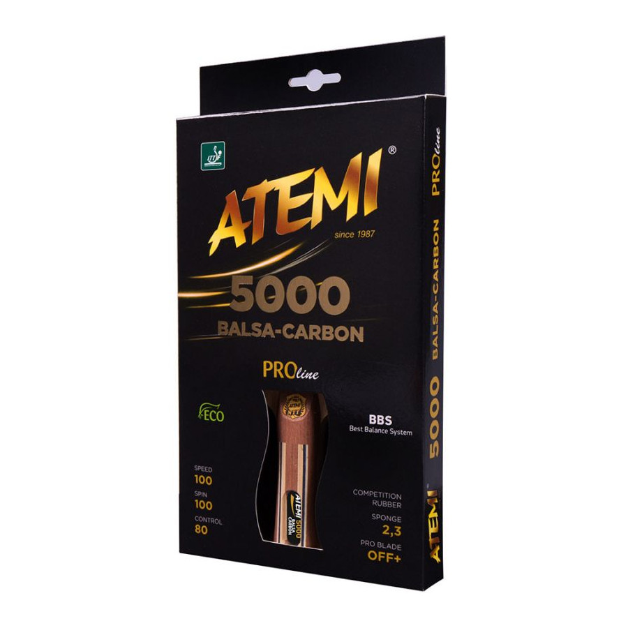 Rakietka do tenisa stołowego Atemi 5000 to produkt przeznaczony dla profesjonalistów, zapewniający rewelacyjną szybkość i kontrolę. Wykonany z najlepszych materiałów: 7-cio warstwowej sklejki z przekładkami karbonowymi i BALSA, gąbki o grubości 2,2 mm, okładzin ofensywnych ( Atemi IPPON ). W skali 1-10: Szybkość: 10 Rotacja: 10 Kontrola: 8 BBS (Best Balance System) System który zapewnia doskonałe czucie piłeczki. Pusta przestrzeń w rączce redukuje ciężar rakietki i przesuwa środek ciężkości dalej od rączki przez to możliwe jest szybsze przyśpieszenie bez straty czucia piłeczki.