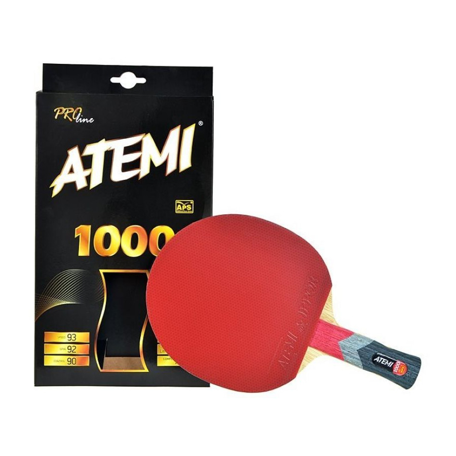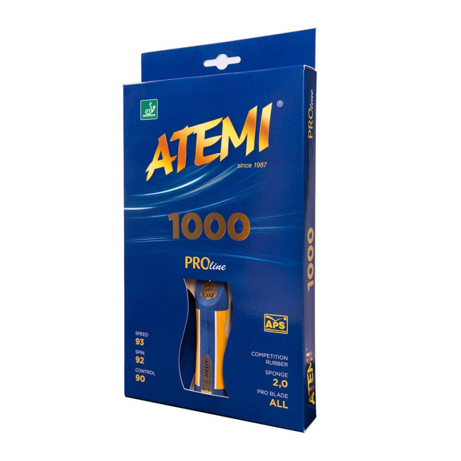 Rakietka do tenisa stołowego ATEMI 1000 PRO LINE. Przeznaczona do zaawansowanej gry ofensywnej. Wykonana z najlepszych materiałów: 5-cio warstwowej sklejki ( Limba, Abachi, Limba ), gąbki o grubości 2,0 mm, certyfikowane okładziny ( Atemi IPPON ).