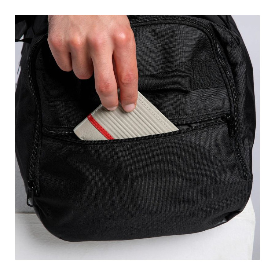 - Boczne kieszonki: jedna otwarta, z siateczki i druga zamykana na zamek.