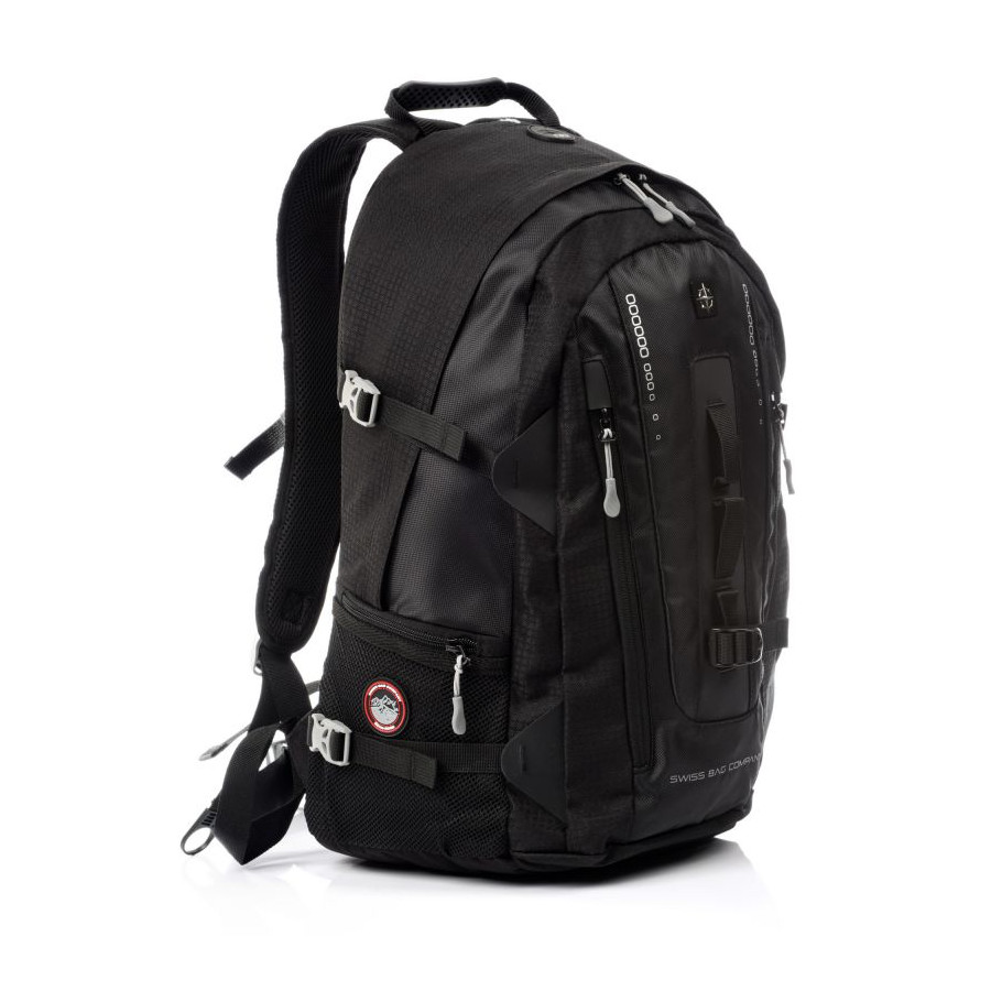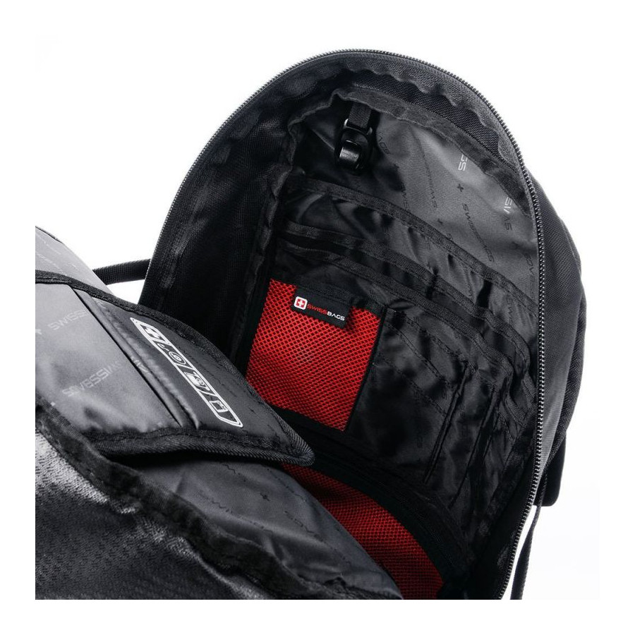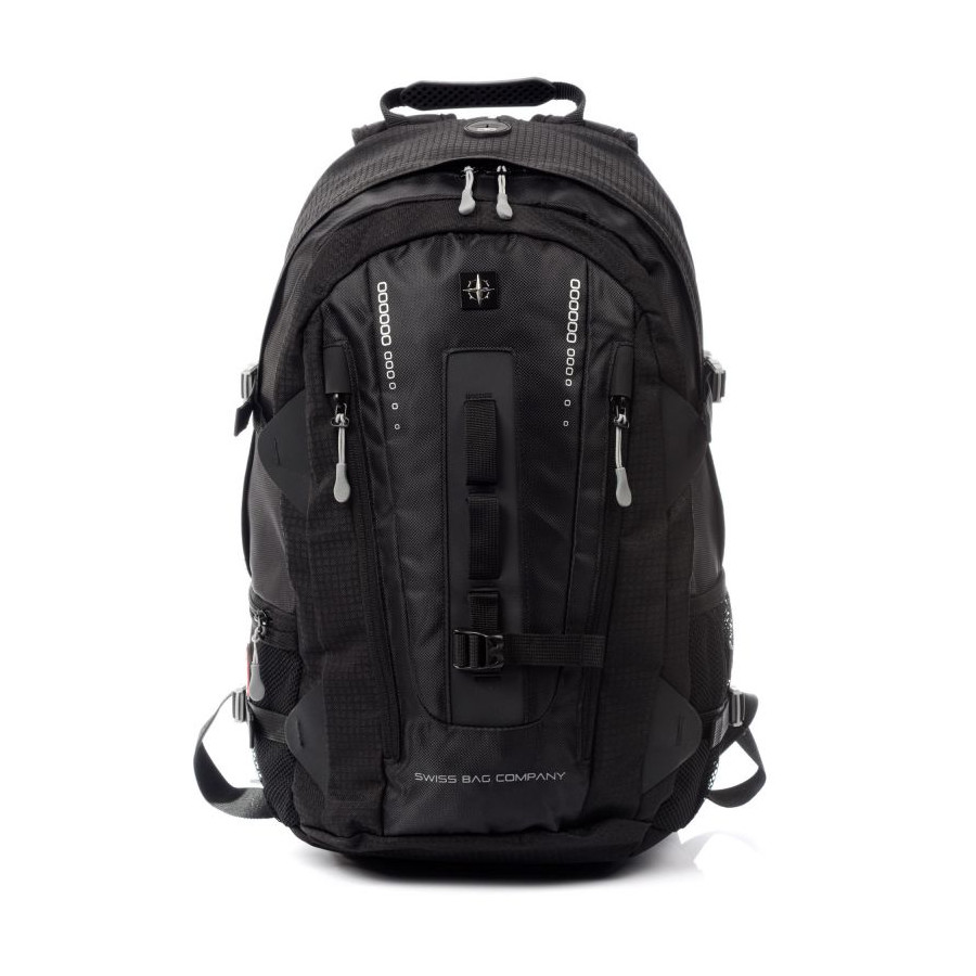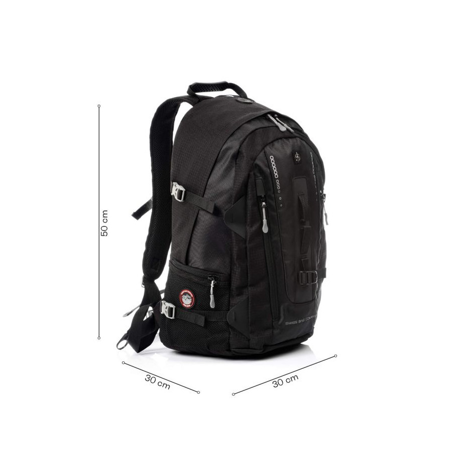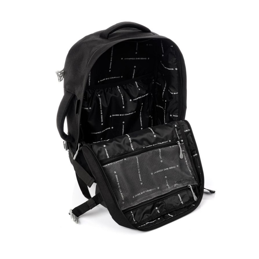 - Został wyposażony w specjalne zapięcia z przodu, piękne szwajcarskie logo i 2 otwierane na zamek komory.