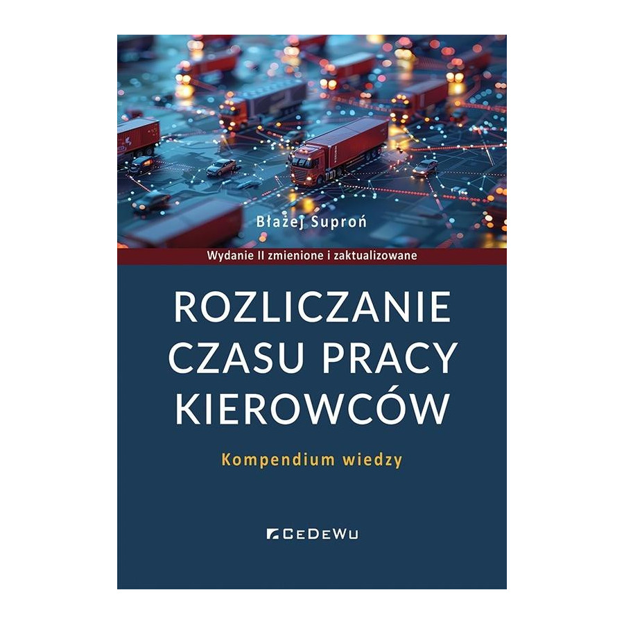 Książka, jako jedna z nielicznych publikacji na rynku, koncentruje się na wiedzy niezbędnej do właściwego rozliczania czasu pracy kierowców i zarządzania przedsiębiorstwem transportowym. Dostarcza kompleksowych informacji dotyczących rozliczania kierowców, planowania i organizacji przedsiębiorstwa transportowego. Zawiera wszystkie najważniejsze zagadnienia, jakie powinna znać każda osoba mająca zawodowo do czynienia z drogowym przewozem ładunków. Autor zawarł w niej także odpowiedzi na pytania, jakie w czasie swojej praktyki otrzymał od przedsiębiorców transportowych, kierowców oraz księgowych. Niniejsze kompendium zawiera szczegółowe omówienie wszystkich aspektów prowadzenia działalności gospodarczej w obszarze transportu drogowego ładunków. Zostało podzielone na pięć części: Podejmowanie i wykonywanie działalności transportowej wszystkie informacje w zakresie uzyskiwania licencji oraz zezwoleń, a także poprawnego wykonywania różnych rodzajów przewozów w Polsce i Unii Europejskiej. Czas pracy kierowców - właściwe planowanie czasu pracy kierowców, takie jak: przerwy, odpoczynki dobowe i tygodniowe, dzienne okresy aktywności. Tachografy i rejestracja okresów aktywności kierowcy - wszystkie informacje na temat zasad poprawnej obsługi tachografów oraz rejestrowania aktywności przez kierowców. Rozliczanie czasu pracy kierowców - praktyczne aspekty związane z kadrami i płacami w firmach transportowych (od tematyki przygotowania właściwych umów, poprzez poprawne naliczanie wynagrodzeń, po przepisy BHP). Kontrole prowadzenie kontroli przez krajowe i zagraniczne służby kontrolne oraz właściwe przygotowanie się do nich. Każde zagadnienie zawiera porady, komentarz autora oraz poparte jest przepisami prawa i orzecznictwem. Stan prawny na 1.10.2024 r.