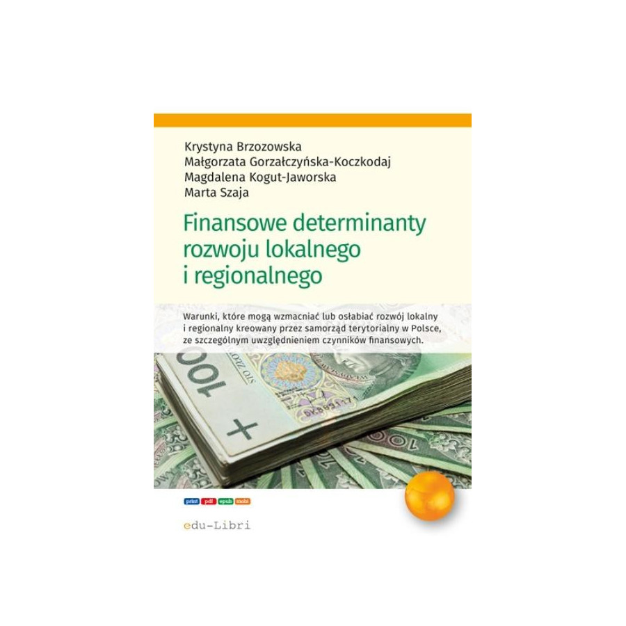 Opracowanie wpisuje się w nurt badań nad możliwościami dalszego rozwoju na szczeblu regionalnym i niższym lokalnym. Celem, jaki postawiły sobie Autorki opracowania, było dokonanie wszechstronnej analizy warunków finansowych, które mogą sprzyjać lub osłabiać rozwój na poziomie samorządów terytorialnych w Polsce. Podjęta problematyka jest skoncentrowana na bardzo istotnym, jeśli nie najważniejszym, elemencie w procesie tworzenia warunków życia społeczności lokalnych, tj. zapewnieniu odpowiednich środków finansowych na realizację działań prorozwojowych. Książka powinna ułatwić decydentom zarządzanie środkami samorządowymi, a także efektywne pozyskiwanie zewnętrznych środków na realizowanie przedsięwzięć inwestycyjnych.