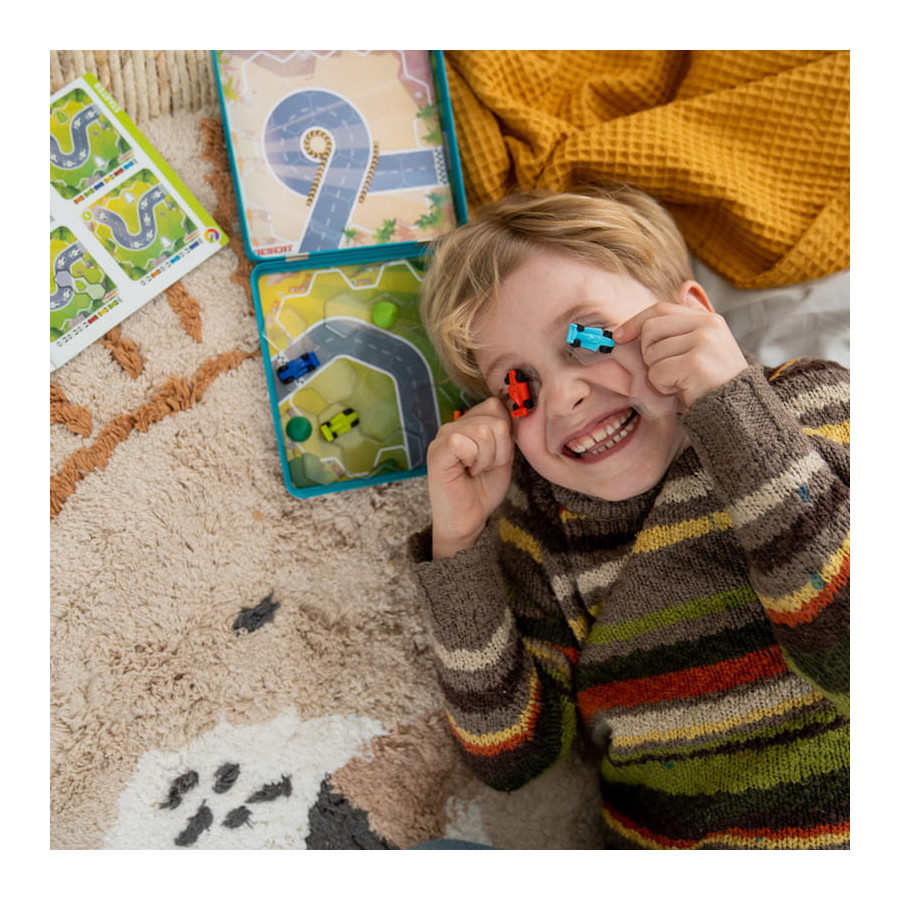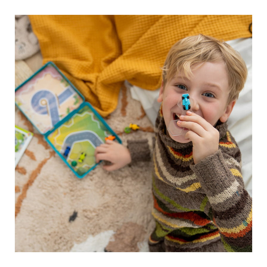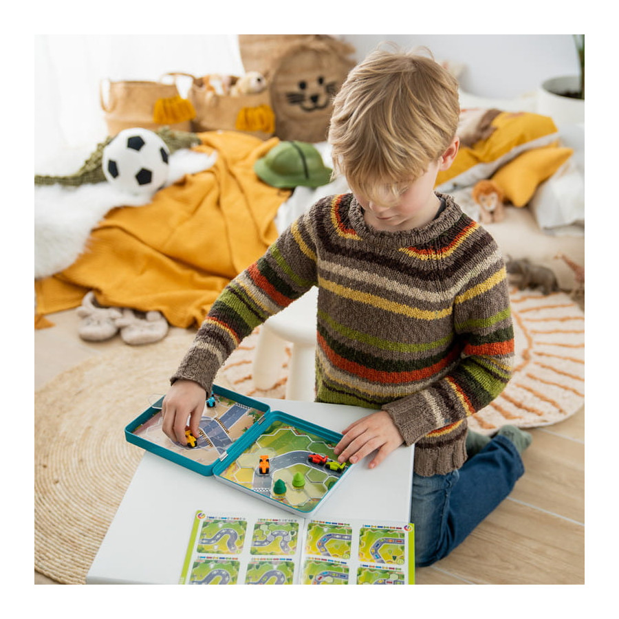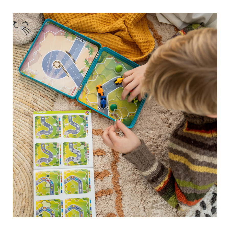 Gotów na trójwymiarową przejażdżkę? Ułóż płytki z samochodami na właściwych miejscach na torze i ścinaj zakręty! Poznaj tę wyjątkową łamigłówkę w poręcznym podróżnym opakowaniu i zostań czempionem 48 trzymających w napięciu zadań na wszystkich 6 torach. Panie i Panowie, odpalcie silniki, to znaczy... szare komórki.