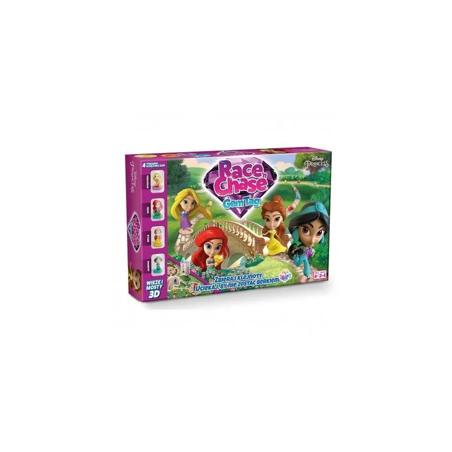 1 tematyczna plansza 4 figurki miniaturowych księżniczek Disneya 3D 2 wieże do rzucania kostkami 3D 1 most 3D 4 obrotowe podesty 2 żetony z lilią 36 żetonów do gry 1 kostka zasady gry