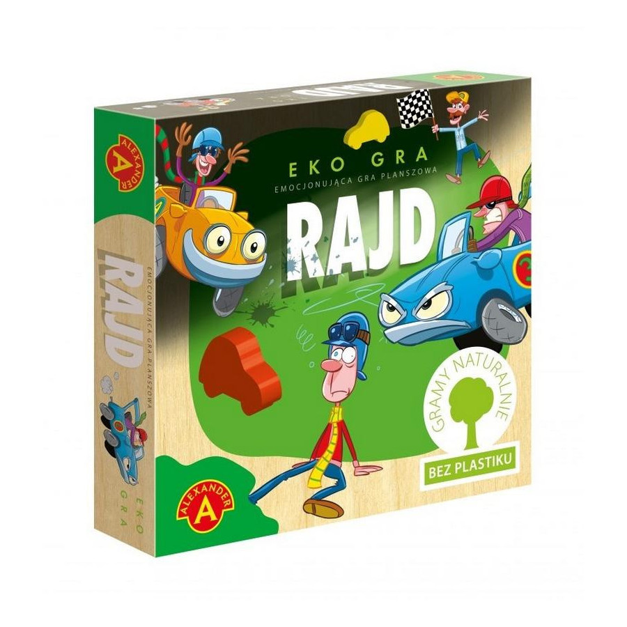 Eko Gra Rajd to emocjonująca gra typu wyścig w której gracze próbują jak najszybciej dotrzeć do mety. Liczba oczek wyrzuconych na kostce wskazuje o ile pól należy przesunąć pionki po torze. W trakcie rajdu po planszy każdego z graczy będą spotykały miłe lub przykre niespodzianki, kary i nagrody. Produkt nie zawiera plastiku. Wykonane z drewna kolorowe pionki w kształcie autek oraz kostka. Elementy drewniane barwione bezpiecznymi farbami wodnymi. Niefoliowana plansza oraz pudełko. Papierowa wypraska. Papier oraz drewno użyte w produkcji gry pochodzą ze sprawdzonych źródeł, które prowadzą zrównoważaną gospodarkę leśną, nie przyczyniając się tym samy do spadku ilości drzew w środowisku.