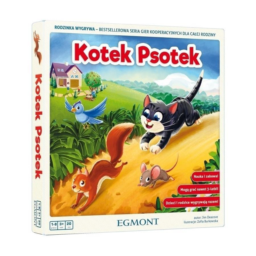 Kotek Psotek uwielbia ścigać się ze zwierzątkami w ogrodzie. Jest bardzo szybki, ale przyjaciele potrafią go przechytrzyć, korzystając ze skrótów na planszy oraz kocich smakołyków. Pomóżcie ptaszkowi, wiewiórce i myszce dotrzeć do kryjówki na drzewie.
