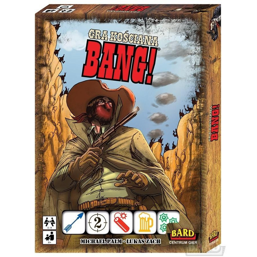 Powrót na Dziki Zachód! Bang! Gra Kościana to nowy rozdział w rodzinie Bang!, jednej z najpopularniejszych imprezowych gier karcianych. Pomysł na rozgrywkę pozostaje taki sam, jak w produkcie podstawowym: wylosuj dla siebie postać oraz tajną rolę, a potem wykorzystaj umiejętności oraz szczęście, aby osiągnąć przypisany do roli cel. Wszystko zmieniają kostki: nigdy do tej pory gra w Bang! nie była tak szybka i emocjonująca. Sytuacja graczy zmienia się z sekundy na sekundę: ktoś traci szansę, ktoś zyskuje nowe możliwości. Czy jesteś gotów wkroczyć do tego ekscytującego, lecz nieprzewidywalnego świata? Bang! Gra karciana to kontynuacja hitu sprzedażowego sprzed paru lat. Marka powraca z nowym, świeżym spojrzeniem na produkt, który wszyscy znamy i kochamy adresowany zarówno do nowych graczy, jak i weteranów. Wprowadzenie do gry kostek pozwala na zupełnie nową jakość rozgrywki: gra stała się płynniejsza, szybsza, bardziej nieprzewidywalna i jeszcze ciekawsza. Do gry wprowadzono nowe karty postaci, które różnią się między sobą umiejętnościami, by starannie obmyślona strategia mieszała się w czasie rozgrywki z elementami losowymi, tworząc iście wybuchową mieszankę! Prawdziwa gra imprezowa: w Bang! Grę kościaną może grać od trzech aż do ośmiu graczy! Rozgrywka trwa jedynie około 15 minut, co czyni ją idealnym pomysłem nie tylko na rozgrywkę w domu, lecz także np. w podróży. Świetne wydanie: Bang! Gra kościana to mała, pięknie wydana pozycja, której nie może zabraknąć zarówno w domu, jak i podręcznym plecaku czy torbie. Zachwyt budzą nowe, jeszcze bardziej komiksowe grafiki, które budują klimat twardego, Dzikiego Zachodu, a także niepowtarzalne kości z symbolami umiejętności.
