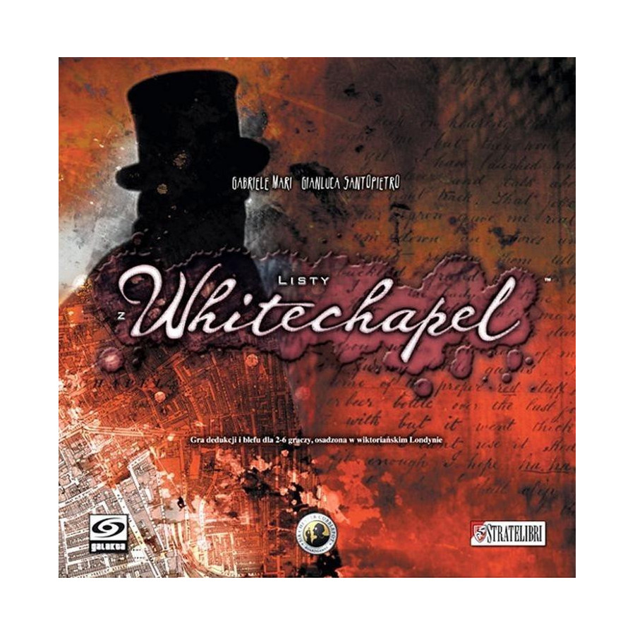 Londyn, 1888 rok, labirynt cuchnących i zatłoczonych uliczek. Niektórzy mówią, że ta dzielnica to piekło. Inni, do których nie uśmiechnęło się szczęście, nazywają ją domem. Na każdym rogu znajdziesz prostytutki. Ludzie nazywają je nieszczęśnicami i nie ma chyba dla nich trafniejszej nazwy. Witaj w dzielnicy Whitechapel. Witaj na ulicach Kuby Rozpruwacza.W Listach z Whitechapel jeden z graczy przyjmuje rolę Kuby Rozpruwacza, a pozostali pięciu detektywów ścigających go po uliczkach wiktoriańskiego Londynu. Kuba Rozpruwacz musi zmylić policyjny pościg w gmatwaninie uliczek dzielnicy Whitechapel i uciec, popełniwszy straszliwe morderstwa. Tymczasem detektywi wykorzystują siłę dedukcji i przewagę liczebną, by go schwytać, nim dokona kolejnej zbrodni. Czy najsłynniejszy seryjny zabójca w historii ucieknie ponownie, czy tym razem dosięgnie go sprawiedliwość? Polowanie się rozpoczyna! Zawartość pudełka: 1 instrukcja, 1 plansza do gry, 5 arkuszy policji, 4 Listy Kuby Rozpruwacza, 5 żetonów Szefów Dochodzenia, 5 żetonów Ruchów Specjalnych, 16 drewnianych znaczników, 12 drewnianych pionków, 1 zasłonka Kuby Rozpruwacza,1 bloczek arkuszy ruchu Kuby Rozpruwacza, 27 plastikowych znaczników. Gra przeznaczona:dla 2 do 6 graczy, w wieku od 13 lat.