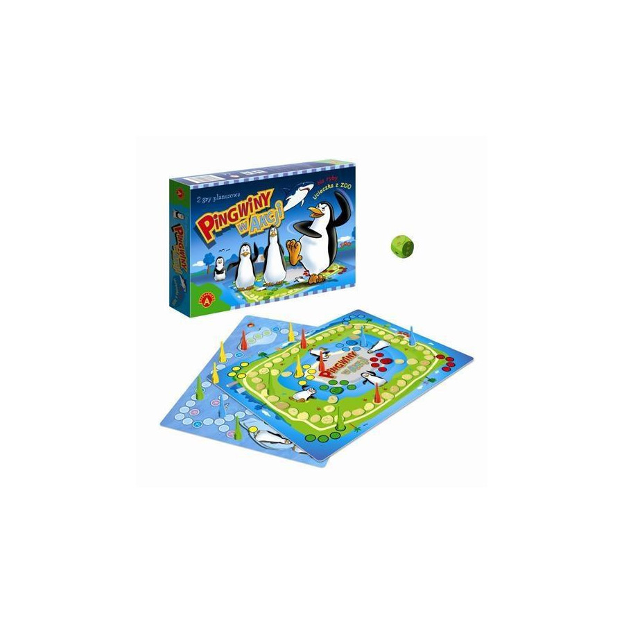 Pingwiny w akcji to 2 gry planszowe. Pierwsza gra Ucieczka z ZOO polega na tym, że każdy z graczy ma swoją drużynę pingwinów, które chcą jak najszybciej wydostać się z ZOO. Zwycięzcą w tej grze zostanie ten, kto pierwszy przeprowadzi swoje pingwiny poza jego mury. W drugiej grze Na ryby pingwiny ruszają na połów ryb. Krążąc po torze planszy gracze starają się trać jak najszybciej na pola, które premiowane są żetonem czyli rybą. Zwycięży ten, kto zdobędzie najwięcej ryb. W czasie połowu trzeba jednak uważać, by nie dostać się w paszczę rekina.