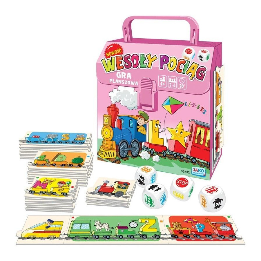 Gra planszowa Wesoły pociąg dzięki prostym zasadom jest odpowiednia dla przedszkolaka, wciągnie także dorosłego gracza. To gwarancja udanej zabawy dla wszystkich, bez względu na wiek. Wybierzcie swoje lokomotywy, parowe ciuchcie lub szybkie elektrowozy. Rzucając kostkami, zdobywajcie wesołe wagoniki i budujcie swoje pociągi. Gracz, który będzie mieć najwięcej wagonów (punktów), wygrywa. W wariancie zaawansowanym wykażcie się znajomością alfabetu i zdobywajcie dodatkowe punkty. Zasady gry Wesoły pociąg: Elementy gry - 30 kartoników z wagonami (2-, 3- i 4-wagonowymi) - 6 kartoników z lokomotywami - 3 kostki z wagonami i dżokerem - 1 kostka z wagonami i stopem Cel gry Zadaniem graczy jest zbudowanie pociągów z jak największą liczbą wagonów (uzyskanie jak największej liczby punktów). Przygotowanie do gry - Rozłóżcie kartoniki z wagonami, pogrupujcie je według kolorów i długości (tworząc pulę). - Kostki połóżcie obok nich. - Każdy gracz bierze po 1 kartoniku z lokomotywą i kładzie go przed sobą. Jeśli graczy jest mniej niż sześciu, niewykorzystane kartoniki z lokomotywami nie biorą udziału w grze. Rozgrywka Grę rozpoczyna osoba, która ostatnio jechała pociągiem (lub najmłodszy gracz). - Gracz w swojej kolejce bierze kostki i rzuca wszystkimi naraz. Może wykonać maksymalnie 3 takie rzuty. Po każdym rzucie może odłożyć na bok wybrane kostki. Pozostałymi rzuca dalej. Raz odłożone kostki może wykorzystać w kolejnych rzutach. - Celem rzutów jest uzyskanie odpowiedniej wartości na kostkach, zabranie z puli zgodnego co do koloru i liczby wagonów kartonika i dodanie go do swojego pociągu. - Jeśli gracz wyrzuci Stop - nie zdobywa żadnego kartonika - grę kontynuuje kolejna osoba. - Dżoker zastępuje dowolny kolor. - Jeśli wyrzucona wartość nie jest dostępna, gracz może zabrać kartonik w danym kolorze o mniejszej liczbie wagonów. - Jeśli w puli nie będzie już kartoników odpowiadających wartości na kostkach, to gracz nie zdobywa żadnego kartonika - grę kontynuuje kolejna osoba. - Podczas jednej kolejki można zdobyć tylko jeden kartonik (jeśli są dwie pary, gracz wybiera jedną z nich). - Kolejka przebiega zgodnie z kierunkiem ruchu wskazówek zegara. Koniec gry Gra się kończy, gdy w puli nie ma już kartoników. Policzcie wagony w swoich pociągach. Każdy wagon to jeden zdobyty punkt. Wygrywa gracz, który zdobędzie najwięcej punktów. Możliwy jest remis. Wariant zaawansowany Punkty ekstra Jeśli chcecie zwiększyć poziom trudności gry, wprowadźcie dodatkową zasadę: za każde połączenie kartoników, w których literki ułożone są zgodnie z kolejnością, w jakiej występują w alfabecie, zdobywacie dodatkowe punkty. Praktyczne opakowanie w formie kuferka zachęci dziecko do posprzątania po skończonej zabawie. Bawcie się i doskonalcie różne umiejętności: - logiczne myślenie - liczenie - znajomość alfabetu - rozpoznawanie kolorów - zdolności manualne - kreatywność i wyobraźnię - spostrzegawczość i koncentrację