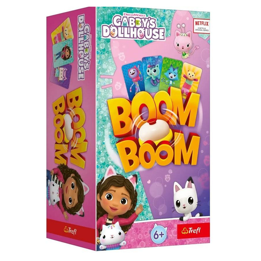 Odsłona gry Boom Boom, w której staracie się zebrać identyczne karty z ulubionymi bohaterami bajki Koci Domek Gabi. Wszyscy gracie jednocześnie, wymieniając karty z ręki z kartami na planszy. Po zebraniu zestawu 4 takich samych postaci uderzacie w dzwonek, sygnalizując wykonanie zadania. Może się okazać, że polujecie na karty tego samego typu kto okaże się szybszy? Gracz, który jako pierwszy zbierze wszystkie zestawy swoich kart, zostaje zwycięzcą!