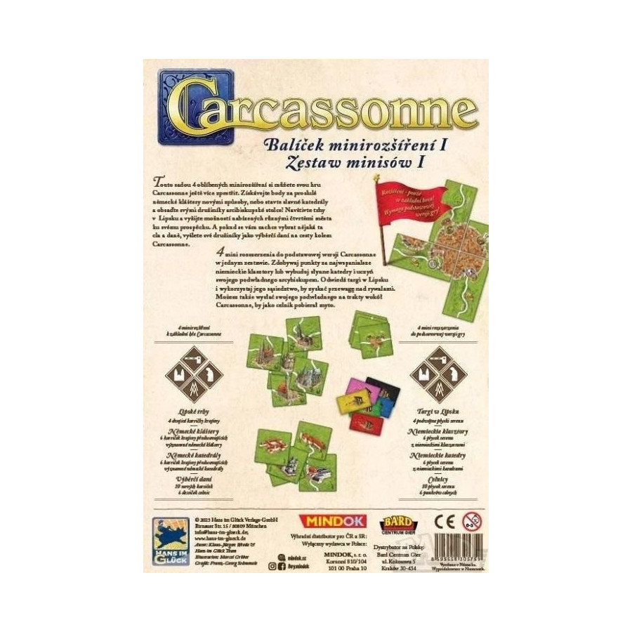 4 mini rozszerzenia do podstawowej wersji Carcassonne w jednym zestawie. Zdobywaj punkty za najwspanialsze niemieckie klasztory lub wybuduj słynne katedry i uczyń swojego podwładnego arcybiskupem. Odwiedź targi w Lipsku i wykorzystaj jego sąsiedztwo, by zyskać przewagę nad rywalami. Możesz także wysłać swojego podwładnego na trakty wokół Carcassonne, by jako celnik pobierał myto.