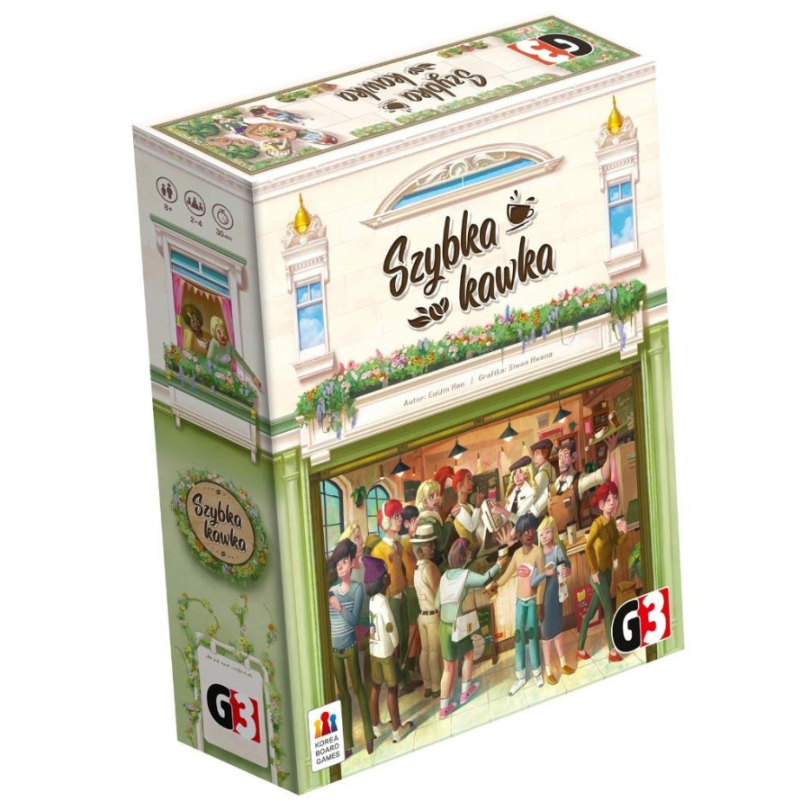 Szybka kawka to rodzinna gra planszowa o zarządzaniu kawiarnią dla 2 do 4 graczy w wieku od 8 lat. W tej grze wszystko dzieje się błyskawicznie, a presja czasu jest ogromna. Główna ulica pełna jest świetnych kawiarni. Ta jest jedną z nich. Wyróżnia ją przytulny wystrój, pyszna kawa, a do tego jest popularna w social mediach. Dla klientów to miejsce relaksu, ale dla baristów to prawdziwe pole bitwy. Każde zamówienie powinno być idealnie przygotowane i podane na czas. Ten biznes dba o polubienia w socialach i za wszelką cenę unika niepochlebnych opinii. Przygotuj wszystkie zamówienia i zostań najlepszym baristą! ZAWARTOŚĆ: Plansza składników 4 planszetki gracza 16 kafelków ulepszeń 6 pionków 2 tace składników 80 kart zamówień 12 filiżanek 102 znaczniki składników 15 znaczników tempa znacznik pierwszego gracza instrukcja
