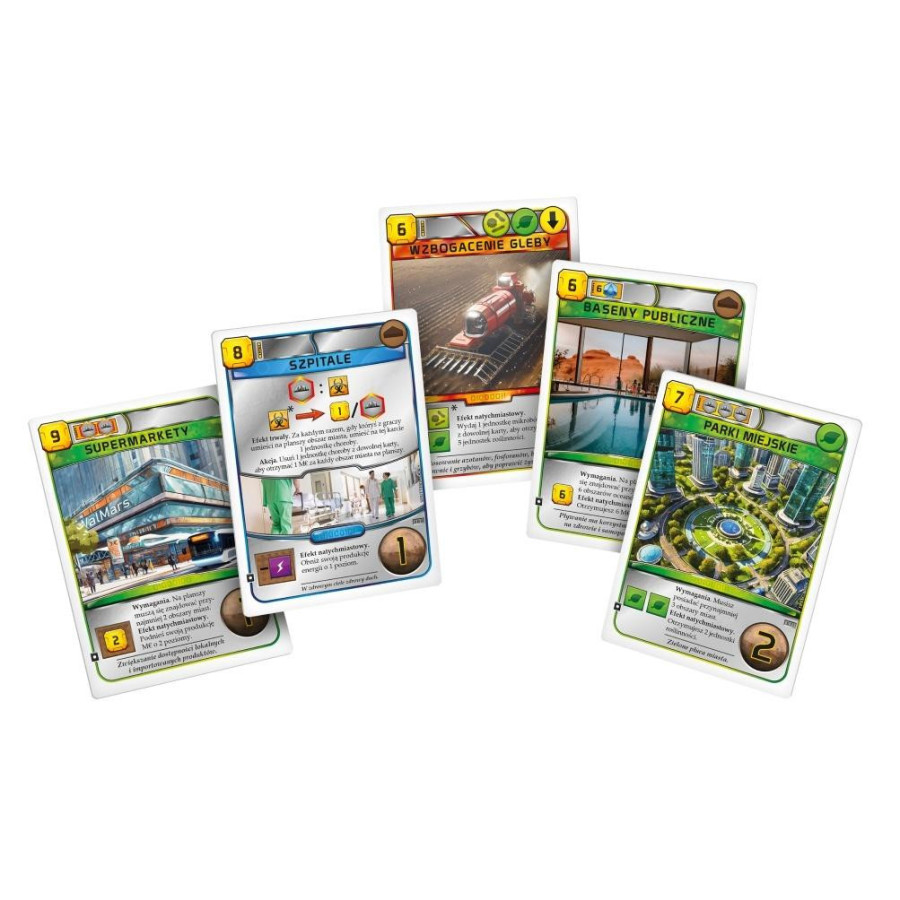 Sprawdź, jaka jest najskuteczniejsza metoda, by poprawić żyzność gleby i wzbogać życie kolonizatorów otwierając pierwsze marsjańskie supermarkety, szpitale, baseny publiczne oraz parki miejskie. Terraformacja Marsa: Zestaw dodatkowy #11 to 5 nowych kart projektów, które czekają na śmiałych inwestorów!