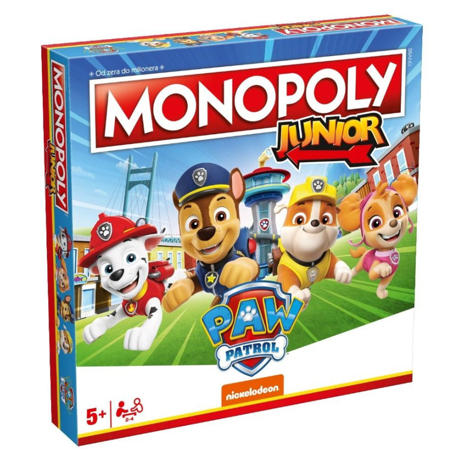 plansza,4 limitowane pionki Psi Patrol,24 karty Misja,36 papierowych znaczników,70 banknotów Monopoly,kostka,instrukcja.Specyfikacjaliczba graczy: 2-4,wiek: 5+,czas gry: 1-3 h,język wydania: polski.Uwaga! Produkt nieodpowiedni dla dzieci poniżej 3 roku życia.