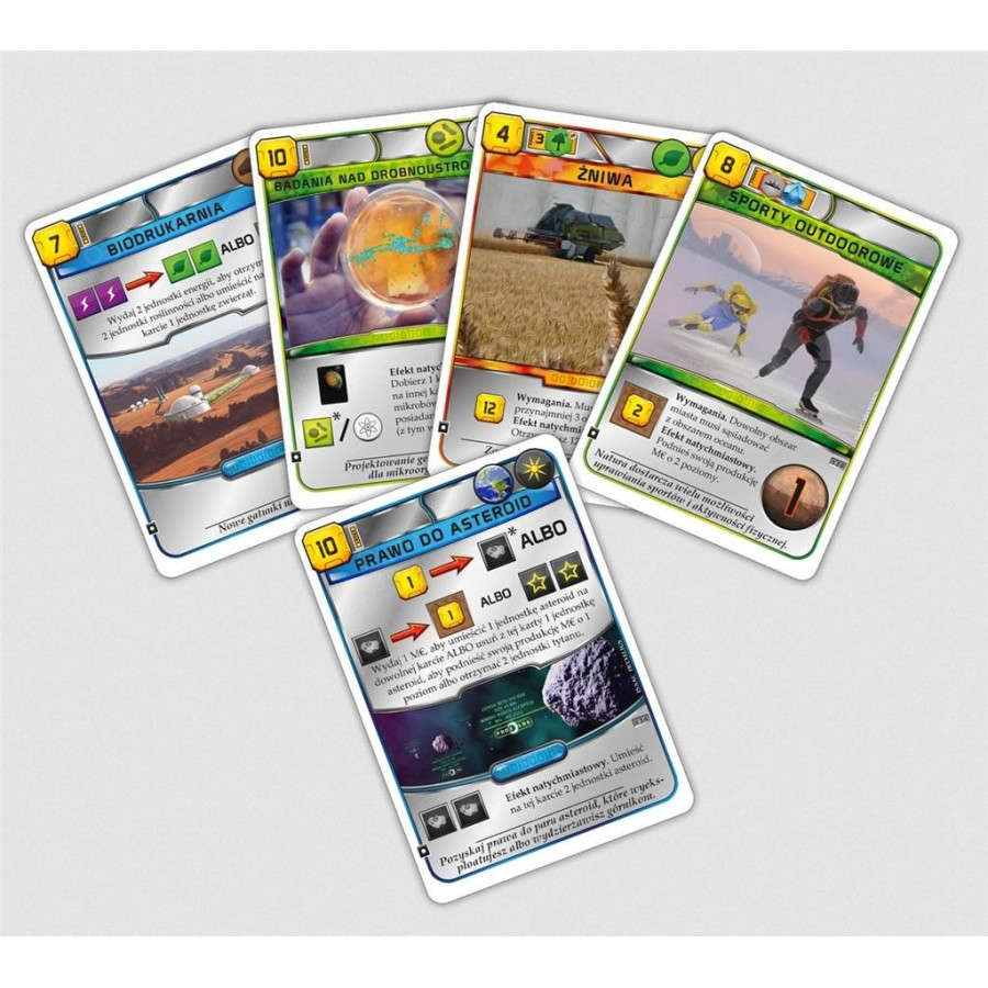 Badania nad drobnoustrojami, które pozwolą Ci połączyć naukowe inwestycje z pozyskiwaniem materiału biologicznego.Biodrukarnie, dzięki którym możesz intensywniej rozwijać na Marsie faunę i florę.Sporty outdoorowe, na których możesz zarobić, jeśli jakieś marsjańskie miasto jest ulokowane w pobliżu oceanu.Żniwa, czyli bezpośrednie przychody ze znajdujących się na planecie obszarów zieleni.Zawartość: 5 kart.