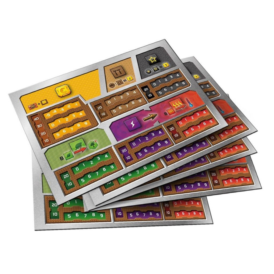 Zestaw 5 plansz graczy sprawi, że na zawsze zapomnisz o powyższych problemach. Dzięki obramowaniu poziom produkcji zaznaczamy na sztywno specjalne miejsce zostało stworzone dokładnie na wymiar kości graczy. Ramka strzeże również wyprodukowanych przez nas surowców, dzięki czemu utrzymujemy porządek i unikamy przypadkowych błędów w liczeniu.