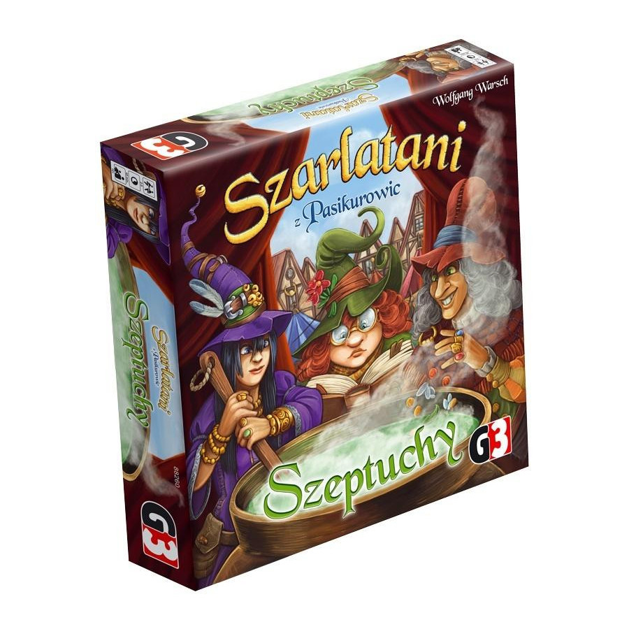 "Szarlatani z Pasikurowic: Szeptuchy" to rozszerzenie do odnoszącej sukcesy na całym świecie gry familijnej Szarlatani z Pasikurowic. Teraz eliksiry może warzyć aż pięciu graczy, ponieważ pudełko zawiera dodatkowe rubiny, składniki i wszystkie elementy gry dla kolejnego gracza. To jednak nie wszystko! Do gry wchodzi nowy składnik - kwiat paproci, który ma zmienną wartość, a także nowa wielka dynia, która wypełnia aż sześć pół w kociołku. Oprócz tego nowe księgi składników, które zapewniają jeszcze większą regrywalność. Kiedy mikstura nie chce się uwarzyć, gracze mogą poprosić o pomoc jedną z trzech szeptuch. To wszystko sprawi, że nie będziecie chcieli odchodzić od kociołków!