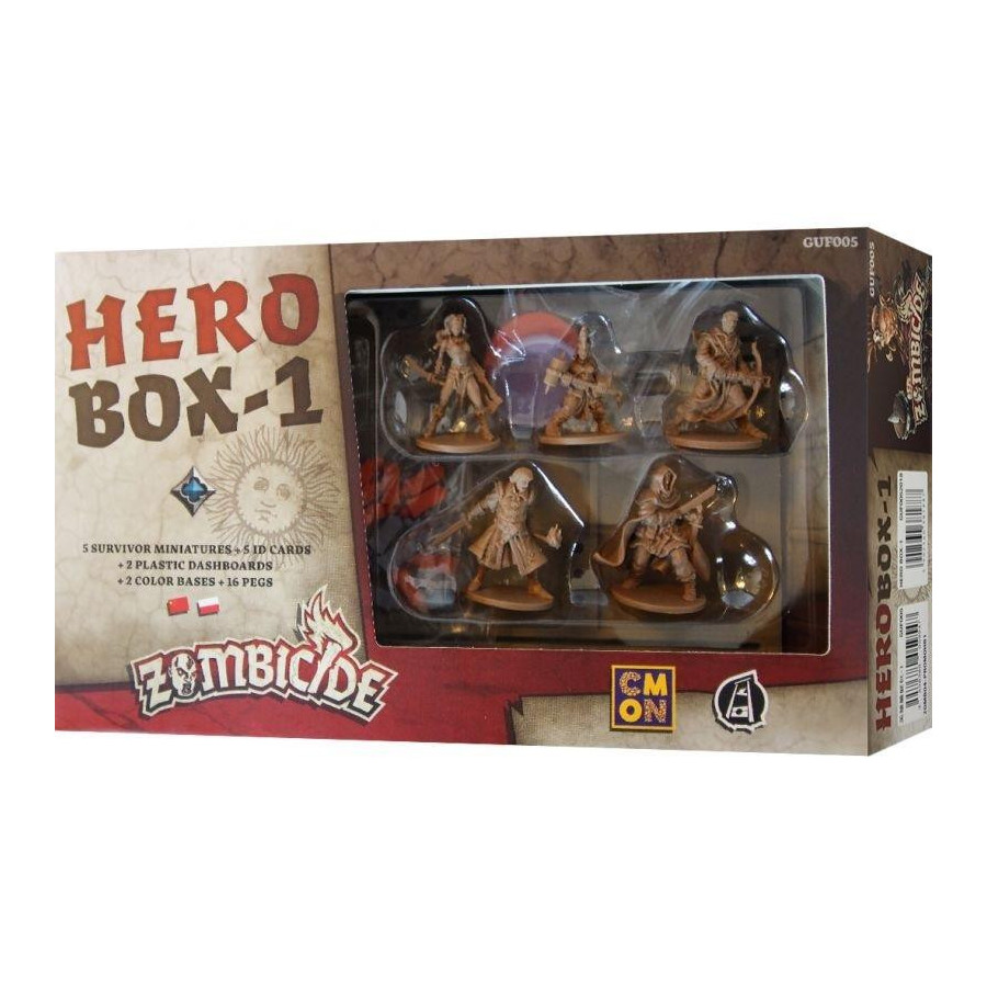 Hero-box 1 zawiera pięciu nowych bohaterów do gry Zombicide, a także dwie nowe plastikowe podstawki, nowe znaczniki i karty. Dzięki temu dodatkowi nie tylko będziesz w stanie wybrać swoich bohaterów spośród większej grupy, ale także będziesz w stanie zagrać z dwoma Ocalałymi więcej,na przykład w 8 osób naraz! Bohaterowie,którzy dołączą do twojej walki o przetrwanie to: Glynda Battlestout, Julian, Sylvia Samedi, Tucker oraz Arnaud.