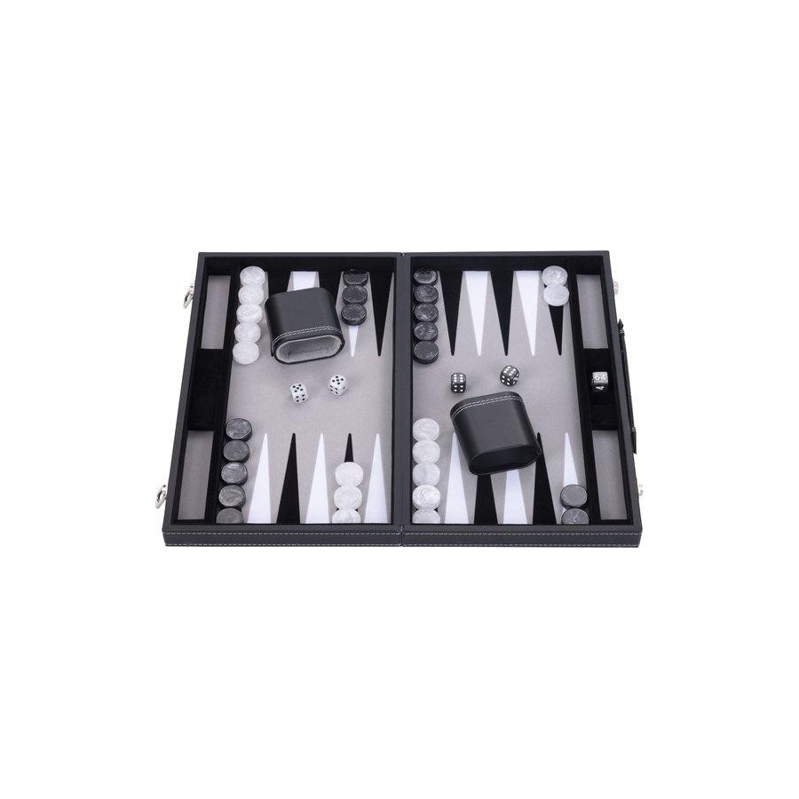 Backgammon 15 cali. Backgammon jest intarsjowany i dostępny w kolorach czarnym, białym i szarym. Gra znajduje się w czarnym etui z PU z uchwytem i jest dostarczana w kolorowym pudełku. Wymiary: 38 x 23 x 5,5 cm.