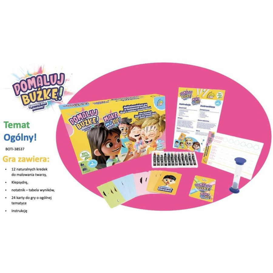W zestawie jest 12 naturalnych kredek do malowania twarzy, klepsydra, notatnik - tabela wyników, 24 karty do gry o tematyce ogólnej.
