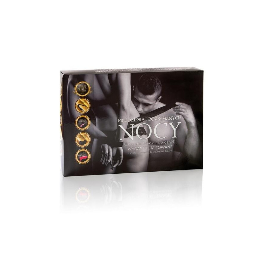 "Kiedy wszedł do sypialni, stałam jak sparaliżowana. Czułam w sobie mieszankę lęku i dzikiego pożądania na myśl o tym, co zaraz wydarzy się między nami. Mały pejcz, który leżał na pościeli był zapowiedzią nowej przygody, ale także... Myśli zaczęły uciekać, kiedy poczułam, jak obejmuje moje dłonie i związuje zimną liną, zakłada opaskę na oczy... na swoich pośladkach czułam twardy dotyk jego męskości... czułam, że już jest gotowy, by wejść... ale to był dopiero początek naszej przygody..." Chcesz doświadczyć takich emocji? Chcecie razem wybrać się w erotyczną podróż do krainy Christiana? Pejcz, kulki gejszy, związane dłonie i stopy... pieszczoty z dużą szczyptą pikantności - to wszystko czeka na Was zamknięte w tym opakowaniu. Jeżeli zawsze chciałaś spróbować, ale nie wiedziałaś jak zacząć... Jeżeli zawsze liczyłeś na bardziej pikantny seks między Wami... kup "Pięćdzieisąt Rozkosznych Nocy" i doświadczaj nowych emocji w sypialni. W środku znajdziecie mnóstwo przedmiotów służących wyłącznie zaspokojeniu Waszych erotycznych fantazji.