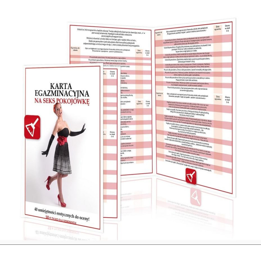 Karta egzaminacyjna na seks pokojówkę to erotyczna przygoda, w której partner wciela się w rolę egzaminatora - pana domu, a partnerka w rolę pokojówki. Uczynnej i seksownej pokojówki, która staje przed swoim egzaminatorem, wyposażonym w listę umiejętności wymaganych przez oficjalny program nauczania seks pokojówek. To egzaminator decyduje, w jakiej kolejności będą wykonywane zadania egzaminacyjne i wystawia pokojówce odpowiednią ocenę. Jeżeli ocena będzie niska, partnerka może próbować starać się o poprawienie swojego wyniku - do czego zachęcamy. Polecamy sprezentowanie pokojówce odpowiedniego stroju, by przygoda była jeszcze bardziej smakowita.