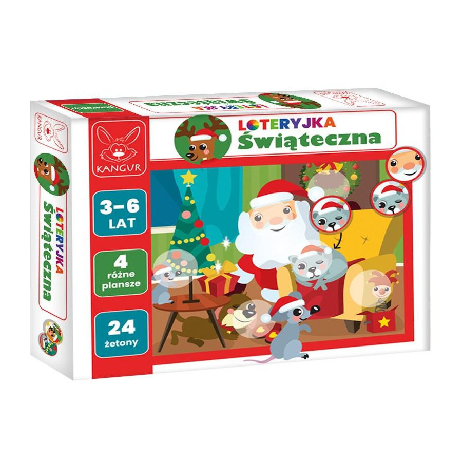Loteryjka świąteczna - odkryjmy razem magię świąt! Jedna z pierwszych gier proponowanych dla dzieci w wieku od 3 lat. Gra zawiera cztery kolorowe ilustracje oraz przygotowane do ilustracji 24 kolorowe żetony. Maluchy układają żetony na świątecznych planszach. Dziecko znajduje odpowiednie miejsce dla żetonu i widzi cała ilustrację.