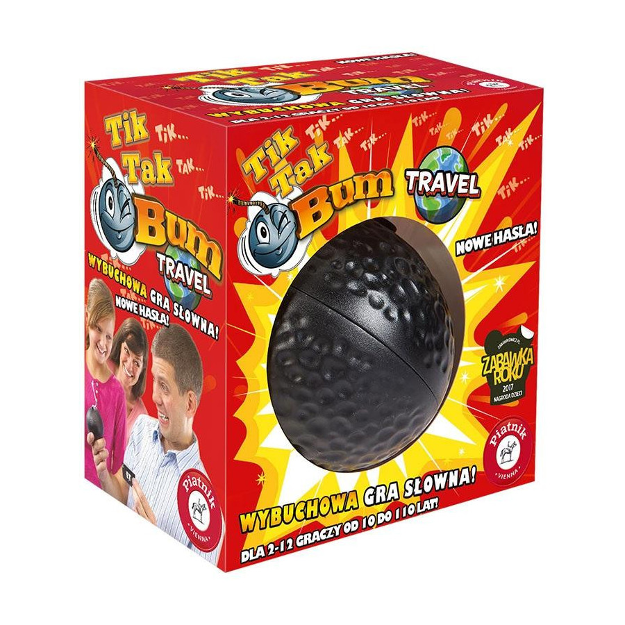 Wybuchowa gra słowna w nowej wersji! Nie dla bojaźliwych! Los każdego gracza wisi na włosku, gdy ta piekielna bomba zaczyna tykać. Trzeba nie lada opanowania, by w takiej sytuacji znaleźć odpowiedni wyraz i pozbyć się bomby, zanim nastąpi wybuch! Kultowa gra Piatnika teraz również w wersji podróżniczej, dzięki czemu można ją zabrać na wakacje, w podróż czy na piknik do parku! Zabawa i emocje gwarantowane! Kreatywność nie lubi się z presją czasu. Czy byłbyś w stanie wymyślić słowo kończące się na dany zlepek liter, trzymając w ręce tykającą bombę, która może wybuchnąć w każdej chwili? Oto genialna w swojej prostocie gra imprezowa, która rozerwie każdego. Gra wymaga opanowania i refleksu, a także ćwiczy kreatywność, spontaniczność i słownictwo. Tik Tak Bum idealnie sprawdzi się na spotkaniach ze znajomymi czy rodziną i zapewni każdemu dużo radości. Teraz dzięki mniejszym gabarytom opakowania, grę można wygodnie zabrać ze sobą na różne wydarzenia. 50 dwustronnych kart zapewnia wiele ciekawych i zabawnych rozgrywek na długi czas. Przez około pół minuty tykająca bomba wystawia graczy na próbę. Losowana jest karta zawierająca kilka liter. Uruchamiany jest mechanizm zegarowy na losowy czas (od 10 do 60 sekund) i pierwszy gracz bierze bombę do ręki. Gracz, na którego przypada kolejka, musi podać wyraz zawierający litery wylosowane na karcie i przekazać bombę sąsiadowi z lewej, zanim nastąpi wybuch! Często wyraz, który wymyślisz oczekując na swoją kolej, zostanie zużyty przez poprzedniego gracza i nawet osoby posiadające bardzo bogaty zasób słów mogą poczuć pustkę w głowie. Proste zasady, maksimum zabawy! Ze wszystkich przetasowanych kart losujemy 10 i układamy je jednym kolorem do góry. Następnie rozpoczynający gracz bierze do ręki bombę, naciska umieszczony na niej przycisk i odwraca wierzchnią kartę. Musi teraz wypowiedzieć wyraz, zawierający podaną na karcie grupę liter. Może ona znajdować się na początku, na końcu lub w środku wyrazu. Nie można jednak zmieniać kolejności liter ani umieszczać innych liter wewnątrz podanej na karcie sekwencji. W grze można używać wyłącznie rzeczowników pospolitych (rozpoczynających się małą literą) w mianowniku liczby pojedynczej. Rzeczowniki nie mające liczby pojedynczej (na przykład spodnie albo widły) mogą być użyte w pierwszym przypadku liczby mnogiej. Tego samego wyrazu nie można użyć dwa razy w tej samej rundzie, natomiast może być użyty w innej rundzie, jeżeli zawiera odpowiednia grupę liter. Wymyśliłeś hasło? Szybko, podaj bombę dalej! Jeżeli udało się wymyślić słowo przed wybuchem bomby, to należy szybko podać ją kolejnej osobie. Powinna ona podać inny wyraz do tych samych warunków. Zabawa trwa do momentu kiedy bomba nie wybuchnie. Wówczas gracz, który w tym momencie trzymał bombę za karę musi zabrać kartę. Przegrany rozpoczyna kolejną rundę, a cała gra kończy się w momencie zużycia wszystkich kart ze stosu. Wygrywa gracz, który zdobył najmniej kart.