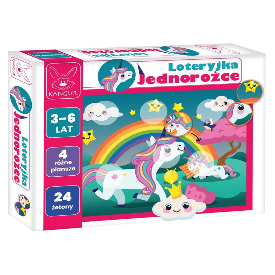 Jedna z pierwszych gier proponowanych dla małych dzieci w wieku od 3 lat. Odkrywanie świata pięknych kolorowych jednorożców będzie wspaniałą przygodą. Gra zawiera cztery kolorowe ilustracje oraz przygotowane specjalnie do nich żetony. Maluchy układają i odkrywają świat. Dziecko odszukuje odpowiednie miejsce dla żetonu. Układa i widzi całą ilustrację.