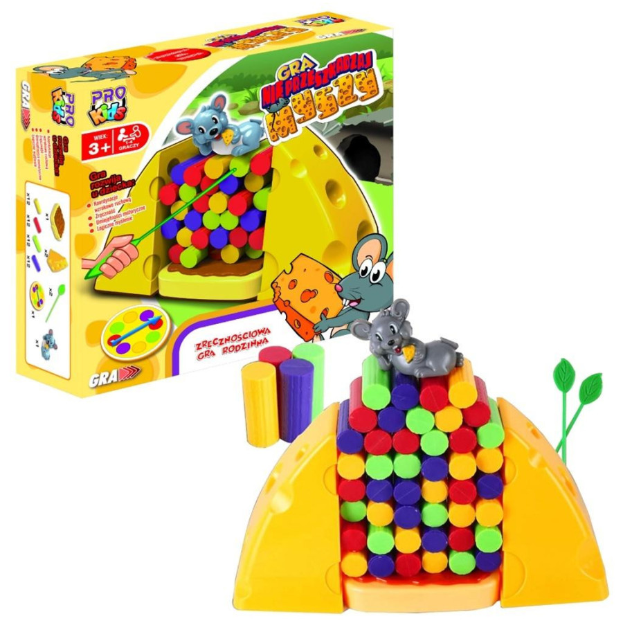 Gra zręcznościowa Nie Przeszkadzaj Myszy polega na zręcznościowym wyjęciu bali spod odpoczywającej myszy. Zakręć strzałką i wylosuj kolor jaki mówisz wyjąc spod stosu, na którym leży myszka. Jeżeli mysz spadnie ze stosu przegrywasz. Kreatywna gra rozwijająca umiejętności logicznego myślenia i spostrzegawczości.