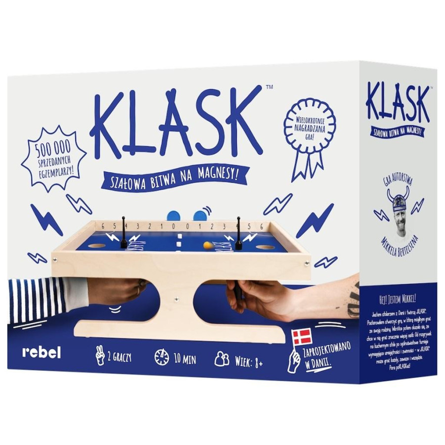 KLASK to wyjątkowa, ekscytująca i jedyna w swoim rodzaju gra z użyciem magnesów. Podczas zabawy mamy jeden cel: umieścić kulkę w bramce przeciwnika! Każdy z graczy dysponuje własnym młoteczkiem, którym steruje spod planszy za pomocą specjalnego magnesu. W ten sposób przepychamy kulkę aż do zdobycia punktu. Ale uwaga! Na stole znajdują się też pułapki w postaci białych magnesów jeśli 2 lub 3 przyczepią się do Twojego młoteczka, przeciwnik zdobędzie cenny punkt!