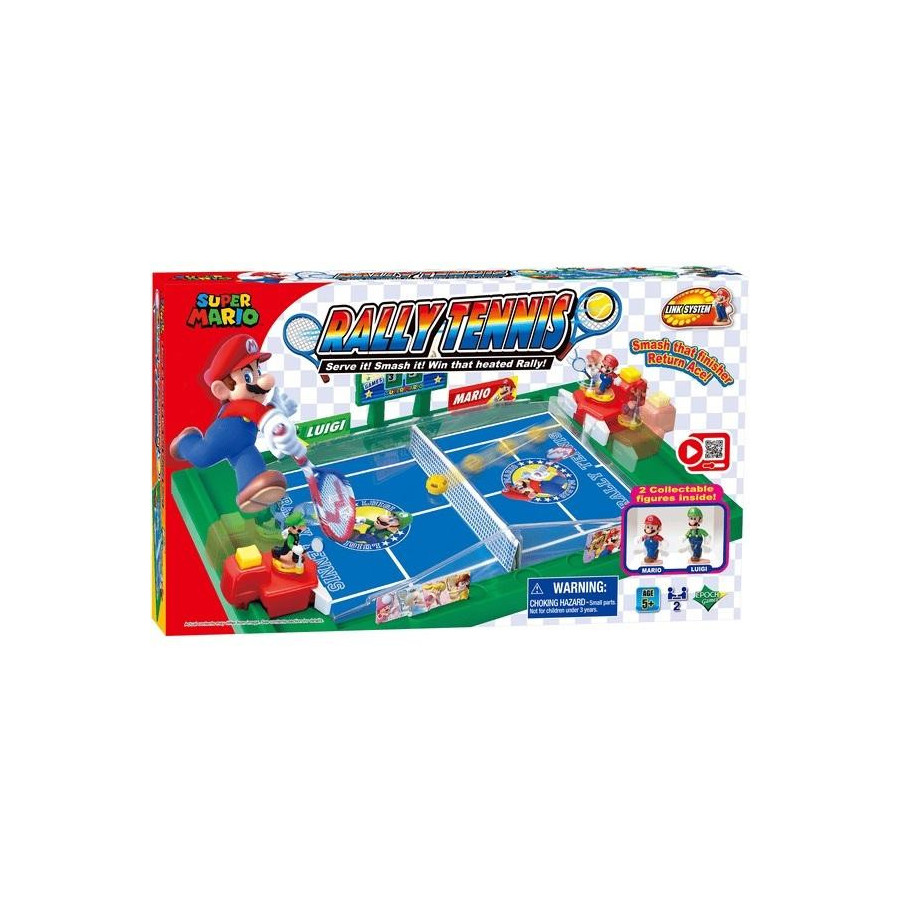 Ekscytująca gra Super Mario tenis z figurkami Mario i Luigiego to mnóstwo dobrej zabawy. Figurki do kolekcjonowania trzymają w rękach rakiety do tenisa. Piłkę odbija się przy pomocy flippera, tak by przeleciała ponad siatką. Flippery można przesuwać tam i z powrotem. Jeśli piłka ominie flipper, przeciwnik zdobywa punkt. Kto pierwszy osiągnie najwyższy wynik, wygrywa rundę. Po każdej rozgrywce następuje zamiana stron. Kto pierwszy wygra 6 rund, wygrywa grę. Zabawka przeznaczona dla dwóch graczy. Zalecany wiek od 5 roku życia.