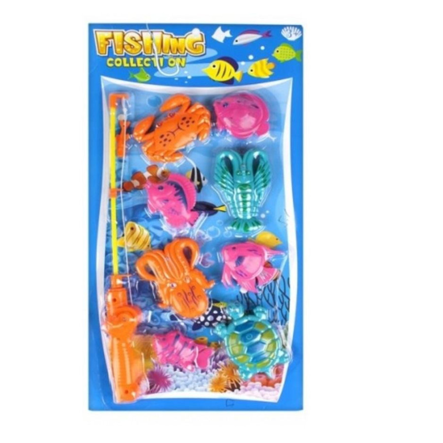 W zestawie znajdują się wędka oraz 4 rybki i żółw wodny. Wszystkie zwierzątka wodne posiadają magnes, dzięki którym łatwo złowić je na wędkę która również posiada magnes. Produkty wykonane z plastiku.