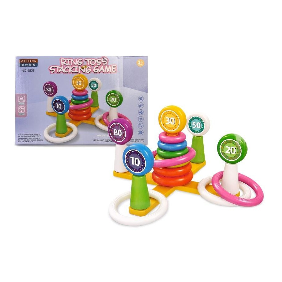 W zestawie: 4 obręcze do rzucania, elementy podstawy, paliki, obręcze do piętrzenia, tarcze z punktacją, funkcje: gra polega na rzucaniu obręczy tak, by trafić na najlepiej punktowany palik,wym. po rozłożeniu 40 x 40 x 25 cm, wym. opak. 38 x 27 x 8,2 cm, 3+