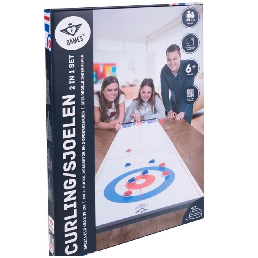 Trzyczęściowa deska do curlingu/shuffleboardu, zawierająca 16 krążków w dwóch kolorach i zasady gry. Elementy są połączone paskami magnetycznymi.