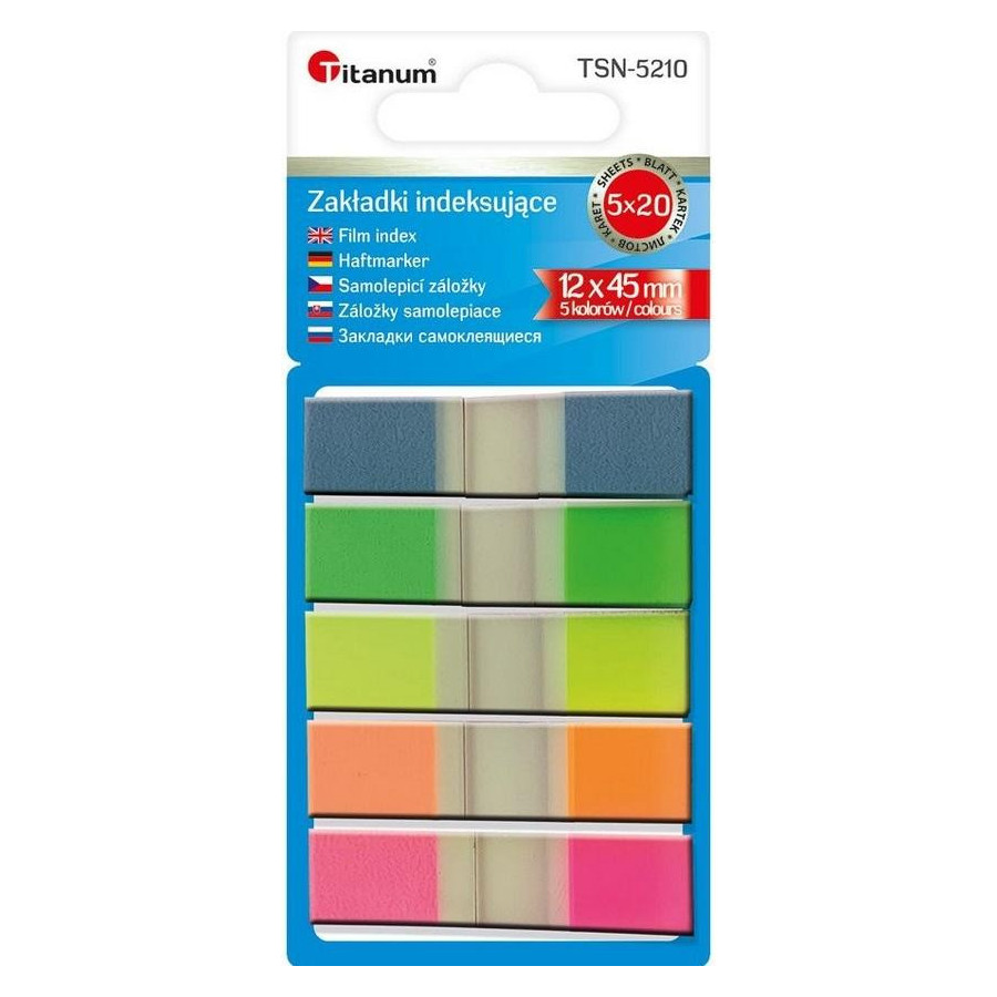 Wykonane z folii polipropylenowej, 5 kolorów fluorescencyjnych: różowy, pomarańczowy,zielony, żółty, niebieski. Rozmiar 12 x 45 mm, 20 karteczek z każdego koloru