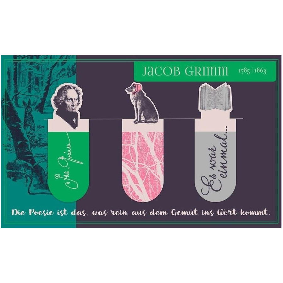 Zakładki Magnetyczne - Jacob Grimm. Nie tylko zaznaczają strony, ale także wyglądają z książki na górze i dlatego przyciągają wzrok. Szczególnie odpowiednie dla miłośników sztuki i literatury. Trzy zakładki magnetyczne w zestawie są tematycznie skoordynowane. Każdy zestaw dotyczy znanego pisarza z minionej epoki i zawiera cytaty, odpowiednie ilustracje do słynnych dzieł lub podpis autora. Skomponuj własną kolekcję z zakładkami Goethe, Schiller lub Shakespeare.