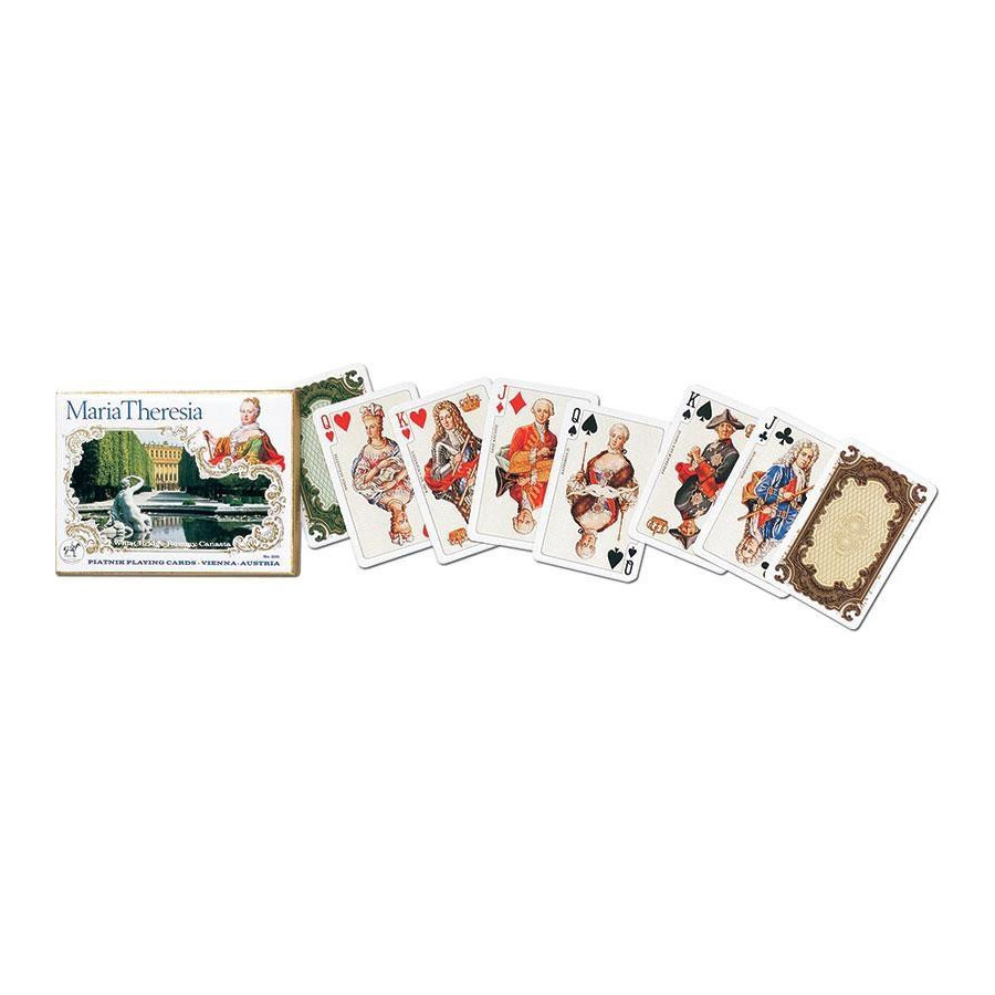 Najwyższej jakości karty do gry renomowanej firmy Ferd. Piatnik & Sohne. W komplecie 2 talie w eleganckim, złoconym pudełku z charakterystyczną poduszeczką. "Maria Teresa" to jeden z najbardziej rozpoznawalnych i lubianych w Polsce wzorów Piatnika. Na awersach europejskie historyczne postaci głównie z XVIII wieku. Rewersy nie tylko szlachetne, ale także symetryczne i wyraźnie różniące się od siebie. Talie składają się z 55 plastikowanych kart o wymiarach 58 x 89 mm i gramaturze 310. Idealne zarówno do brydża, pokera, remika jak i innych gier. Wyroby wiedeńskiej fabryki Ferd. Piatnik & Sohne od 1824 roku urzekają bogactwem wzorów i perfekcją wykonania. Jakość i tradycja!