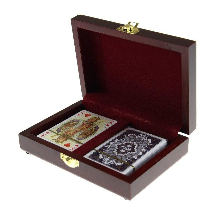Ekskluzywny zestaw kart Piatnika w szkatułce z ciemnego drewna z z delikatnie widocznymi słojami, wyściełane bordowym, miękkim materiałem.