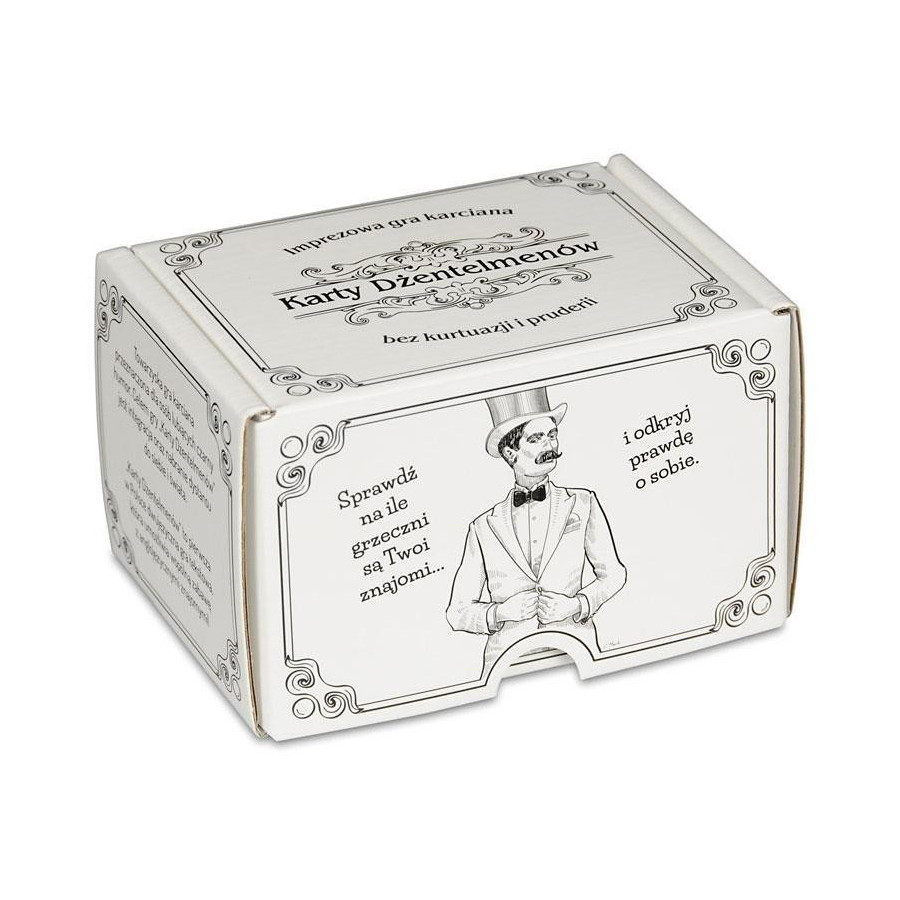 Karty Dżentelmenów to imprezowa gra towarzyska bez kurtuazji i pruderii, za to z ogromną dawką czarnego humoru. Dżentelmeńskie rozgrywki z pewnością urozmaicą każde spotkanie w gronie błyskotliwych i obdarzonych niebywałym poczuciem humoru osób. Nie powinno jej zabraknąć na Twojej imprezie! Produkt posiada przejrzyste zasady, co zachęci każdego do gry i pozwoli szybko wczuć się w atmosferę pełną czarnego humoru. Grą kieruje prosta mechanika: w każdej kolejce Dżentelmen zadaje pytanie z Czarnej Karty, a pozostali odpowiadają za pomocą swojej najzabawniejszej Białej Karty. Drugim sposobem wykorzystania gry Karty Dżentelmenów jest tworzenie z jej pomocą opowieści pełnych czarnego humoru bez cenzury. Podczas gry w Dżentelmeńskie Opowieści wszyscy gracze wspólnie tworzą absurdalne i wciągające historie w oparciu o frazy z Białych Kart. Pozwólcie się zaskoczyć efektami Waszej kreatywności! Gra Karty Dżentelmenów dzięki eleganckiej oprawie nadaje się na wyszukany i na pewno trafiony prezent. Jako jedyna na polskim rynku gra karciana zawiera anglojęzyczne odpowiedniki pytań i odpowiedzi, dzięki którym pokonuje bariery międzykulturowe i umożliwia zabawę na międzynarodowym poziomie.