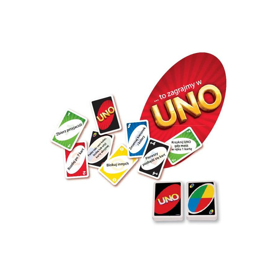 Gra karciana, składająca się ze 108 kart w 4 różnych kolorach oraz kart akcji. Celem gry jest jak najszybsze pozbycie się kart w każdej rundzie i zdobycie punktów za karty, które zostały w rękach innych graczy. Zwycięża gracz, który jako pierwszy zdobędzie 500 punktów. Po wyłożeniu przedostatniej karty gracz musi krzyknąć UNO, tzn. jeden. Jeśli nie krzyknie i zostanie przyłapany, bierze kolejne karty.