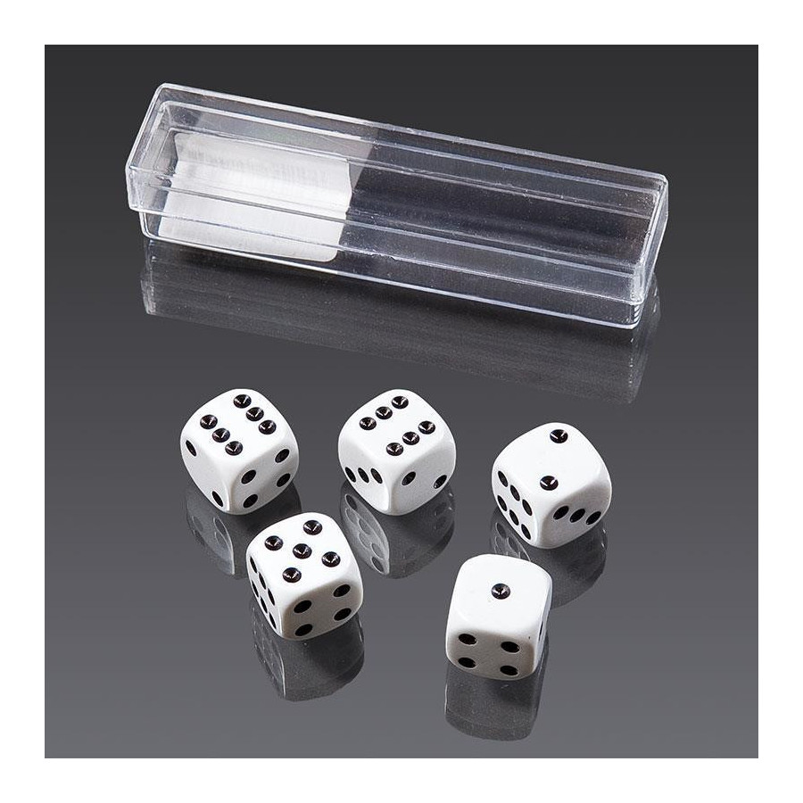 Zestaw 5 kości (16 mm) w przezroczystym etui. Dołączona instrukcja do gry w kości oczkowe w języku polskim.